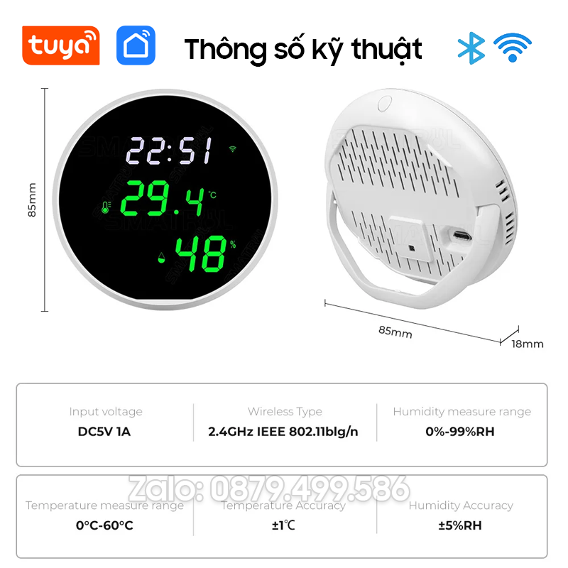 Sản phẩm có khả năng đo được nhiệt độ, độ ẩm hiển thị thông số lên màn hình LED đồng thời gửi thông báo đến điện thoại của bạn cảnh báo trong những trường hợp điều kiện môi trường bất bình thường thông qua app Tuya Smart được tải về từ kho ứng dụng.