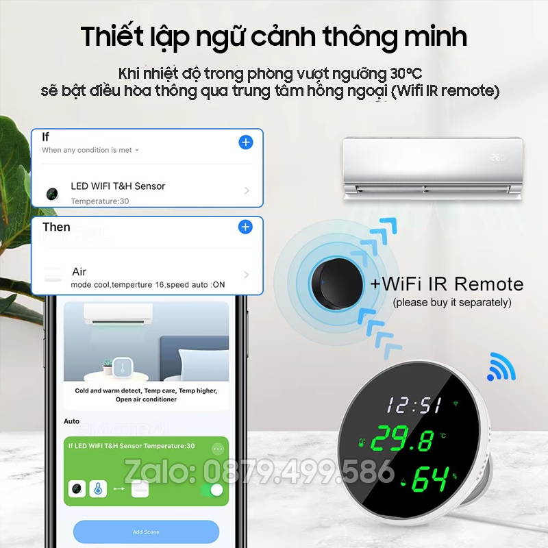 Cảm biến nhiệt độ độ ẩm này có thể dễ dàng treo lên hoặc để trên một mặt phẳng bất kì, để đem lại sự thoải mái, tiện nghi nhất cho gia đình mình, bạn có thể kết nối với các thiết bị thông minh Tuya khác để thực hiện ngữ cảnh tự động bật điều hòa khi trời quá nóng, bật máy phun sương ẩm khi không khí trong phòng quá khô và ngột ngạt.