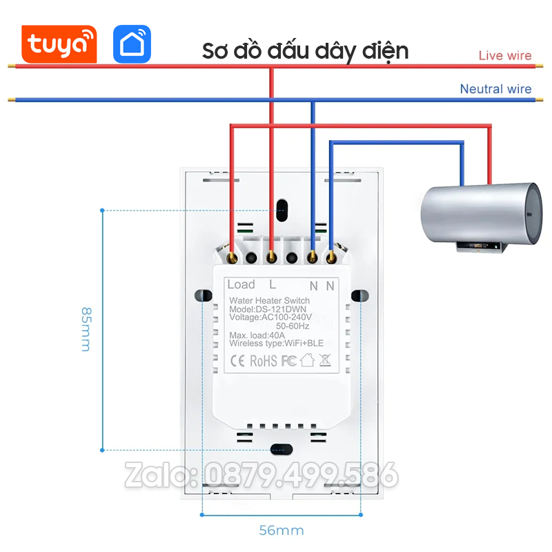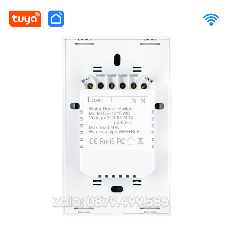 Công Tắc 40A Bình Nóng Lạnh 121DWN Hình Chữ Nhật Wifi Smart Life Tuya