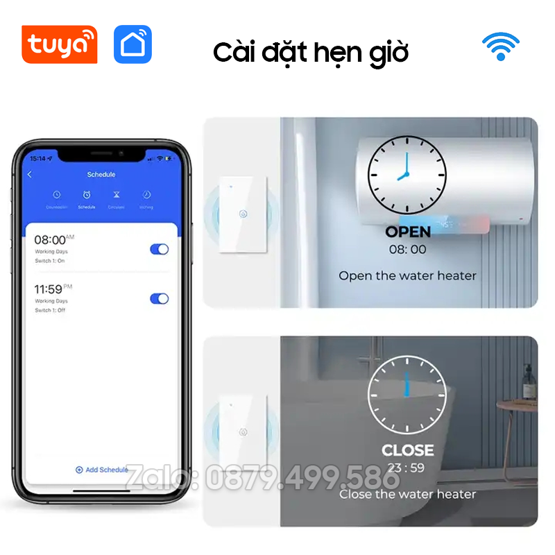 – Cài đặt lịch trình hẹn giờ bật tắt hàng ngày(ví dụ: Hẹn giờ cứ tới 17h bật bình tới 18h tắt bình hàng ngày).